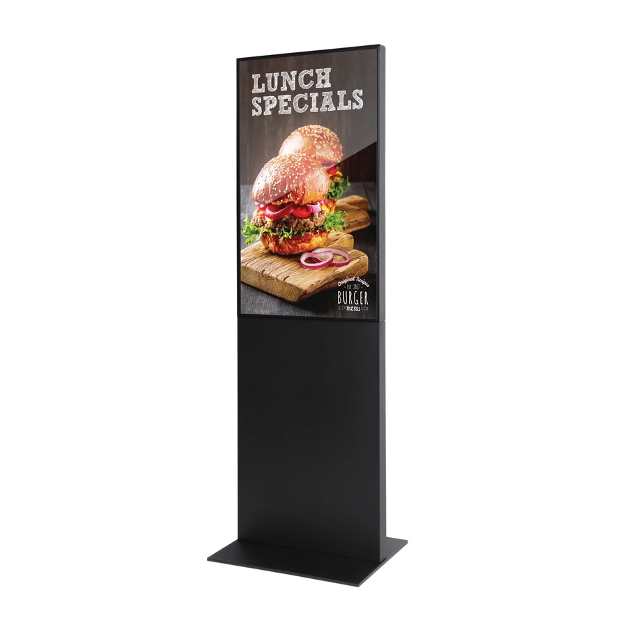 Ez a keret nélküli kialakítással készült totem egy rendkívül elegáns digitális display állvány, melynek 8 mm vastag tömör fém talp adja a stabilitását. Igény szerint fixen le is csavarozható a fém talpon keresztül. A megfelelő szellőzés érdekében a kijelző előtt nincsen előlap, így a nap 24 órájában szolgáltathatja a reklámtartalmat. Annak ellenére, hogy a professzionális Samsung kijelző a totemoszlopba van beépítve, mindössze 60 mm vastagságú. A totemoszlop hátsó oldalán kivezetett USB és LAN csatlakozókon keresztül a digitális tartalmakat könnyen kezelhetjük.